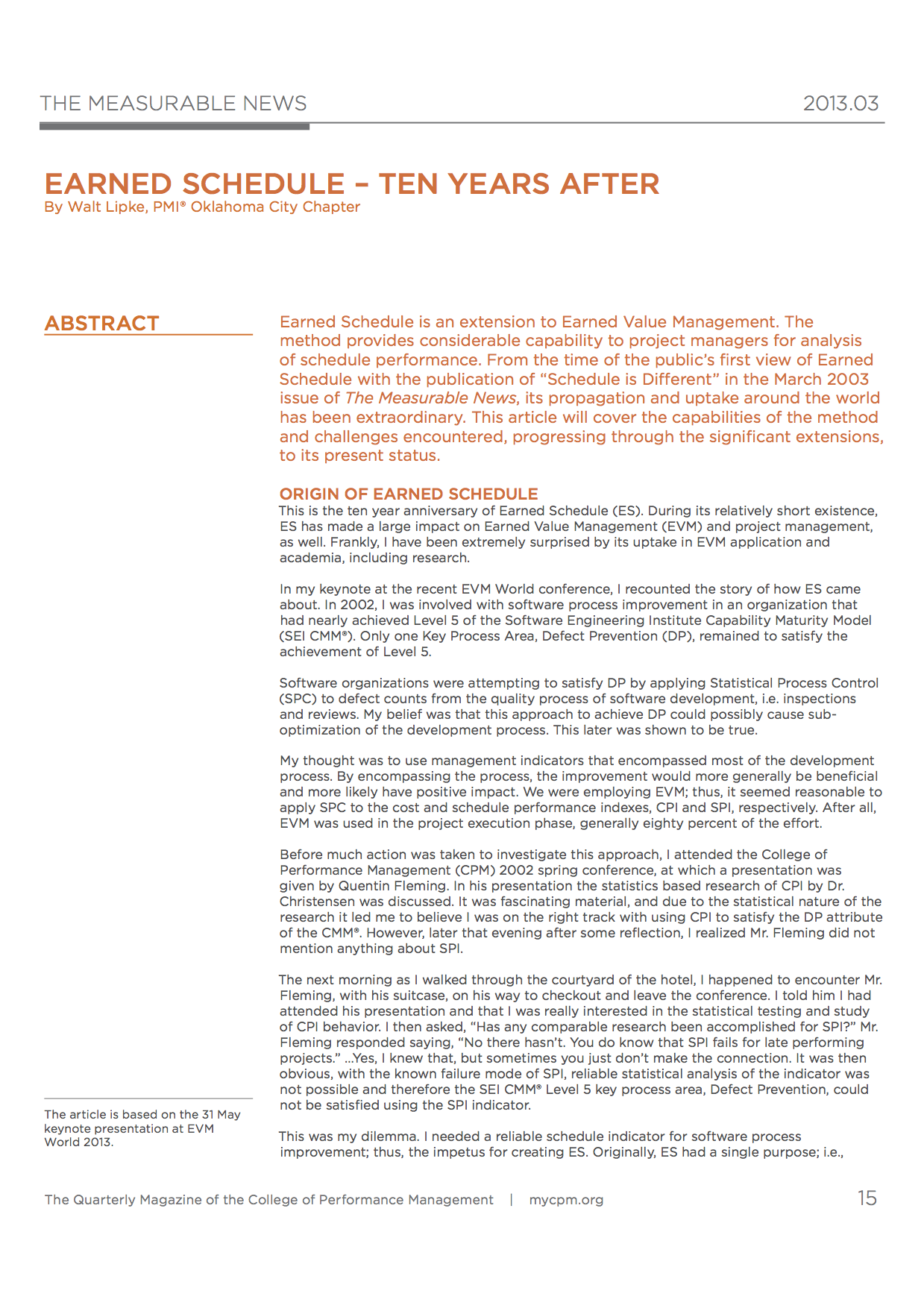 The article is a perfect read to have an idea of the ES concept and clearly shows the progress from the initial publication of the first paper "Schedule is different" to the absorption and recognition of its value as a good alternative project control tool. I suggest to all my students to download this article here!